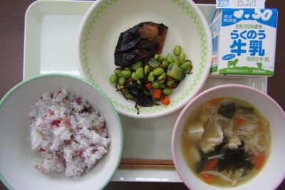 今日のメニューは、梅ご飯、節そうめん汁、ホッケの照り焼き、枝豆と昆布の和え物、牛乳でした。