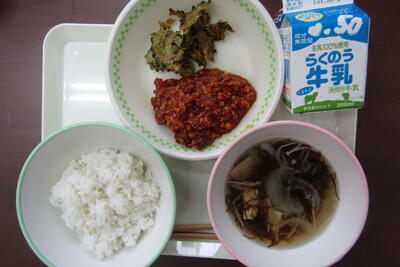 今日は沖縄のオンパレード。タコライスは人気メニューですね。もずく汁にはもずくと昆布が入って、沖縄らしい汁です。ゴーヤチップはカリッと仕上がり、苦みが少なかったですが、さて、子どもの反応やいかに。今日もおいしくいただきました。