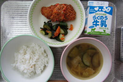 今日は夏野菜のみそ汁。きゅうりに見えるのは、実際はズッキーニです。他にも、かぼちゃ、なす、インゲン、タマネギなどが入っていて(もっと入っていたら、給食センターの皆さんごめんなさい)、食感と味を楽しみました。ホキのフライは衣がサクサクでした。今日もおいしくいただきました。