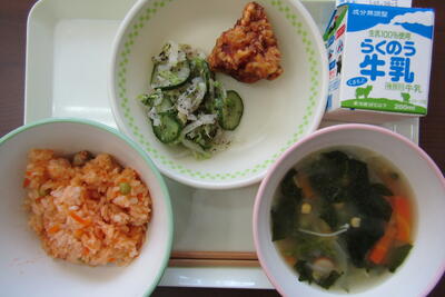 今日で前期終了。来週火曜には後期がスタートするとはいえ、けじめの日とあって、給食も人気のメニューでした。チキンライスは、写真の通り、色鮮やかで、具だくさん。唐揚げも、タレにつけ込んで、味がしみていました。いつも以上に調理が大変だったと思いますが、今日もおいしくいただいました。