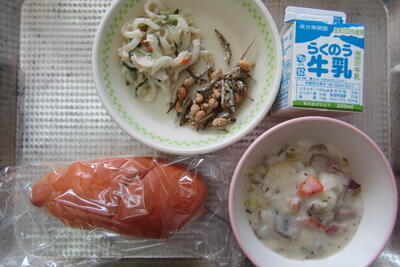 今日のメニューは、ミルクパン、秋野菜のシチュー、大根とササミのサラダ、いりこと大豆のりんかけ、牛乳でした。
