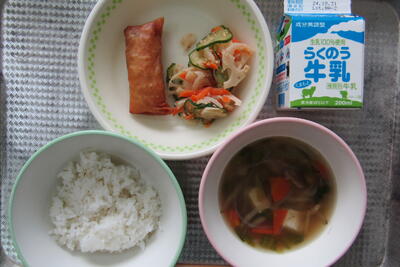 今日のメニューは、麦ご飯、豆腐とレタスのスープ、春巻き、レンコンのごま和え、牛乳でした。