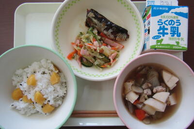 今日のメニューは、栗ご飯、つぼん汁、いわしの甘露煮、梨だれ和え、牛乳でした。