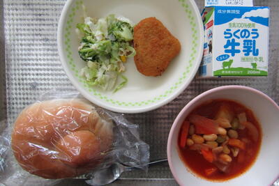 今日のメニューは、ひのくにパン、ポークビーンズ、栗コロッケ、ブロッコリーのサラダ、牛乳でした。