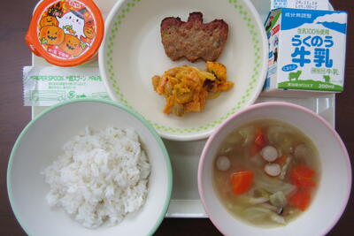 今日のメニューは、麦ご飯、コンソメスープ、かぼちゃ型ハンバーグ、お豆のスパイシーサラダ、かぼちゃムース、牛乳でした。