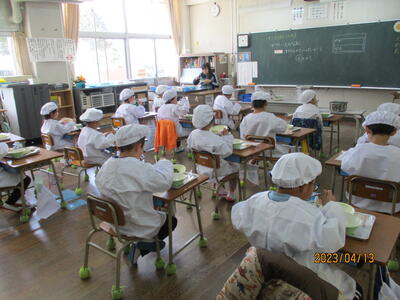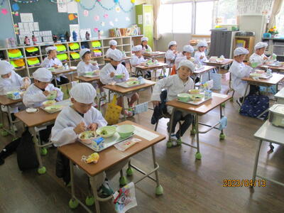 給食の時間には、準備や片付けの仕方をひとつずつ教わりました。おかずを注いだり運んだり、みんなで協力しながら頑張りました。愛情の込もったおいしい給食を、静かに食べました。
