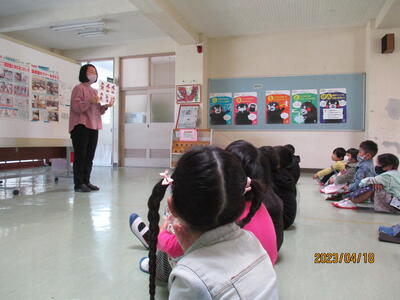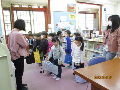 1年生にとっては初めての図書室の利用でした。静かに司書の先生の話を聴き、また色々な本を借りたり読んだりできることを知ってとても嬉しそうな様子でした。