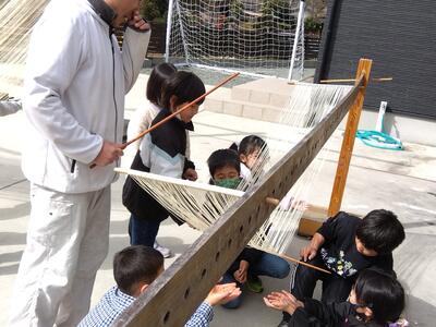 手延べそうめんとして有名な地元の南関そうめん。そのそうめんづくりのお仕事をされている保護者の方にご協力いただき、どんな風にお仕事をされているのかを見せていただきました。麺を伸ばして干したり、切ったり、様々な工程を経ておいしい南関そうめんがつくられていることを知りました。