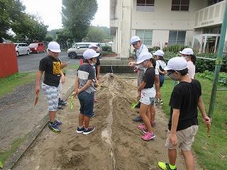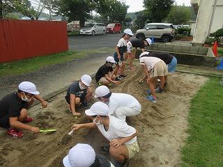 学校の砂場を使って「川」を作り、水を流す実験を行いました。