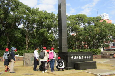 その後、3歳で被爆された田中安次郎さんと合流し、原爆落下中心地、浦上天主堂、如己堂、永井隆記念館、山里小学校、平和公園でフィールドワークを行いました。原爆投下時の遺構に直接触れることができて、原爆の悲惨さについて肌で感じることができました。