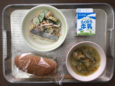 今日のメニューは、コッペパン、魚のハーブ焼き、マカロニサラダ、キャベツと肉団子のスープ、牛乳でした。