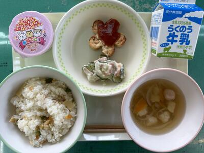 今日のメニューは、たけのこご飯、麩のすまし汁、花型豆腐ハンバーグ、ポテトサラダ、いちごゼリー、牛乳でした。