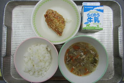 今日のメニューは、ごはん、牛乳、みそ汁、豚肉の野菜の炒め物、黒糖大豆でした。