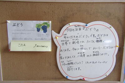 今日の注目は、旬のくだもの「ぶどう」です。ぶどうは世界で栽培され、たくさん種類があります。今日は、みんなに種なしでおいしいぶどうを食べてほしくて、給食センターから八百屋さんに相談されたそうです。たいへんおいしくいただきました。
