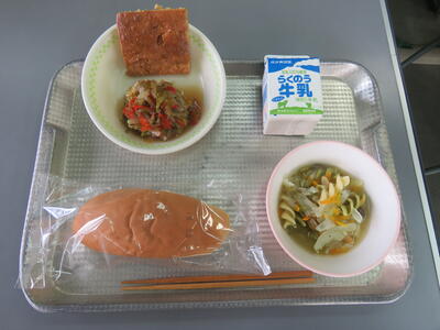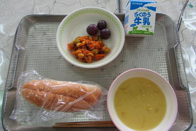 今日のメニューは、コッペパン、牛乳、コーンスープ、チリコンカン、ぶどうでした。