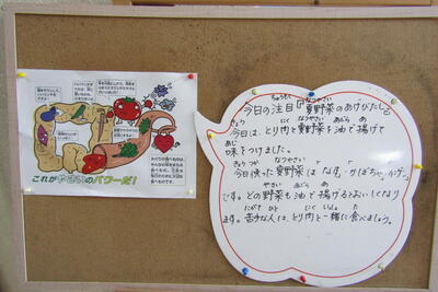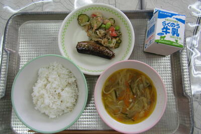 今日は、鶏肉と夏野菜を油で揚げて、味をつけてありました。今日使われた夏野菜は、「なす」「かぼちゃ」「インゲン」です。どの野菜も油で揚げるとおいしくなります。野菜が苦手な人は、鶏肉と一緒に食べると食べやすくなりますよ。
