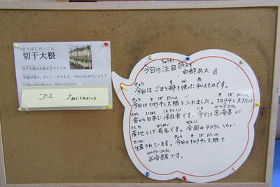 切干大根は、昔から日本にあった保存食です。今は、産地として、宮崎県が有名です。全国の90%ほどを生産されているそうです。今日の切干大根も宮崎県産でした。切り干し大根は、大根を干すことで、大根の水分量が減り、栄養価が高くなり、おいしくなるそうです。