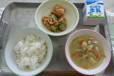 今日のメニューは、麦ご飯、牛乳、きつねうどん汁、鶏肉と夏野菜のあげびたしでした。