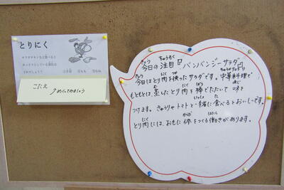 今日のメニューは、麦ご飯、牛乳、五目汁ビーフン、バンバンジーサラダ、きなこ豆でした。今日の注目「バンバンジーサラダ」は、鶏肉を使ったサラダです。中華料理で、もともとは、蒸したとり肉を棒でたたいて味をつけていたそうです。(だから、棒々鶏なのですね。)きゅうりやトマトと一緒に食べるとおいしいです。鶏肉には、主に、体をつくるはたらきがあります。