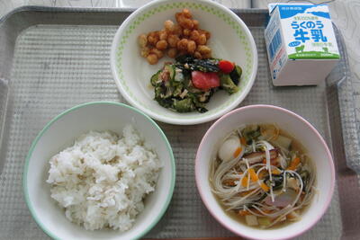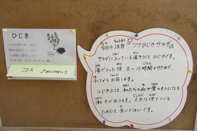 今日のメニューは、ごはん、牛乳、キャベツと肉団子のスープ、ツナひじきサラダ、デザートでした。今日のサラダに入っている海藻はひじきです。ひじきは、海でとった後、8~10時間かけてゆで、干してから出荷されます。ひじきには、わたしたちの血や骨のもとになる働きがあります。丈夫な体をつくるためにも、食べてほしい食材です。それでは、クイズです。「ひじき」を漢字で書くと、ある動物の名前が入っています。それは、何でしょう?答えは、鹿(しか)です。ひじきは漢字で「鹿尾菜」と書きます。