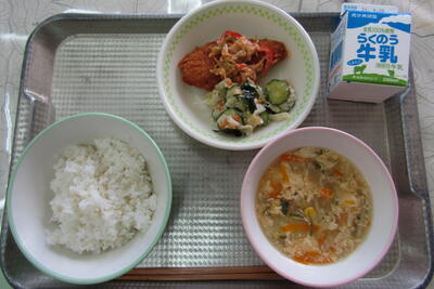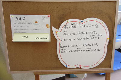 今日のメニューは、麦ご飯、牛乳、たまごスープ、魚のオーロラソース、チキンのごまだれでした。今日はたまご入りのスープでした。いろいろな卵がありますが、日本で一番食べられているのは、ニワトリの卵です。筋肉など、おもに体をつくる働きがあります。