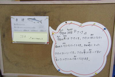 今日の注目は、「さけ」です。魚の「鮭」です。鮭は、秋になると自分が産まれた川に戻ってきます。そのときにとった鮭がおいしいです。鮭の身は赤いですが、食べたエサによって赤くなるそうです。では、クイズです。秋が旬の鮭ですが、春から夏にかけてとれる鮭のことを何と呼ぶでしょうか。答えは、「時知らず」です。