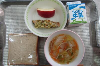 今日のメニューは、黒糖パン、牛乳、白菜スープ、魚のタルタル焼き、くだもの(りんご)でした。