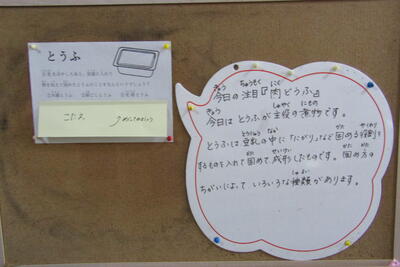 今日の注目は、肉豆腐です。今日は、豆腐が主役の煮物です。豆腐は、豆乳の中に「にがり」など固める役割をするものを入れて固めて成形したものです。かため方の違いによっていろいろな種類があります。では、ここでクイズです。豆乳を冷やしたあと、容器に入れて熱を加えて固めた豆腐のことをなんというでしょうか?答えは、「充填とうふ」です。この充填豆腐は保存がきく豆腐です。固め方によって食感が違います。