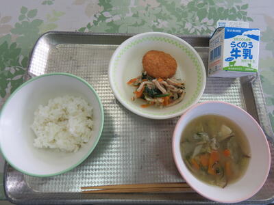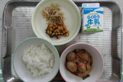 今日のメニューは、ご飯、牛乳、さといものそぼろ煮、ざぜん豆、白菜のおかかあえでした。