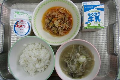 今日のメニューは、豚キムチ丼、牛乳、白玉団子入りきのこ汁、ヨーグルトでした。