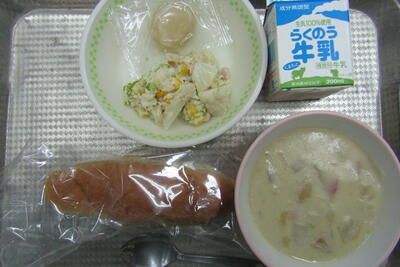 今日のメニューは、玄米パン、牛乳、南関野菜のみそシチュー、カリフラワーとツナのサラダ、いきなりだんごでした。