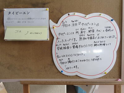 今日の献立「タイピーエン」は明治時代に中国から熊本に伝わった料理で、今では熊本のご当地料理のひとつです。もともとはアヒルのゆでたまごを使ったスープワンタンのような料理ですが、日本ではアヒルの卵が手に入りにくいので、にわとりのたまごで代用し、ワンタンの代わりに春雨を使って作ります。味つけもしょうゆ・とんかつ・塩があります。