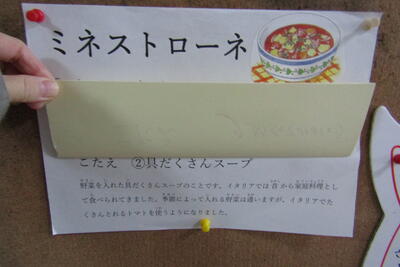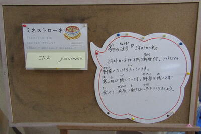 今日の注目のミネストローネは、イタリアの料理です。トマトなどの野菜がたっぷり入っています。寒い日が続いています。野菜を残さず食べて、病気に負けない体をつくりましょう。