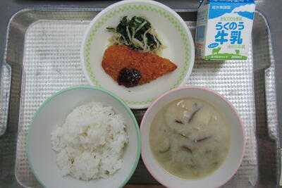 今日のメニューは、ご飯、牛乳、豆乳入りみそ汁、ぶりのフライ、ごま酢あえでした。
