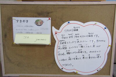 今日は南関中学校1年生のリクエスト給食でした。冬野菜をたっぷり使ったメニューのすきやきでした。すきやきは肉と野菜、とうふなどを一緒に入れて、煮込んで作ります。栄養たっぷりの料理です。みかんもついていますので、残さず食べて寒さに負けない体を作りましょう。ここでクイズです。「すきやき」の名前の由来になっている「すき」とは、次の3つのうちどれでしょうか。①牛の名前、②農作業の道具、③鍋の名前・・・答えは、②農作業の道具です。田や畑を耕すときの道具のことです。「すき」の上で焼いて食べたのが始まりです。