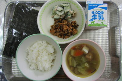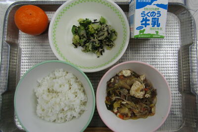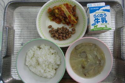 今日のメニューは、ごはん、牛乳、みそ汁、豚肉の野菜の炒め物、黒糖大豆でした。