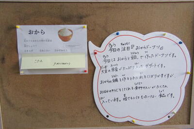 今日の注目の「おからドーナツ」は、おからと豆乳で作ったドーナツです。大豆の栄養がたっぷり入ったデザートです。おからは豆腐を作るときに出るしぼりかすです。お腹のそうじをしてくれる食物繊維がたくさん入っています。捨てるにはもったいない食品です。では、クイズです。次の3つの言葉のうち、おからの別の名前は何でしょうか?①きらず、②あじさい、③かすみそう・・・答えは、①きらずです。雪花菜と書きます。おからは切らずに使えることや、白い雪のような花という意味を込めて「雪花菜(きらず)」とも呼びます。