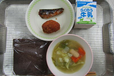今日のメニューは、ココアパン、牛乳、野菜スープ煮、いわしトマト煮、おからドーナツでした。