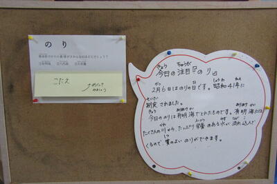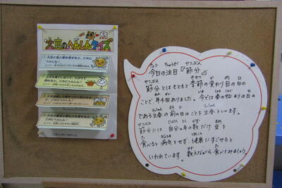今日の注目は「節分」です。節分とはもともと季節の変わり目の日のことで、年4回ありました。今では、春の始まりの日である立春の前の日のことを節分といいます。節分には、自分の年の数だけ豆を食べると病気をせず、健康に過ごせるといわれています。数えながら食べてみましょう。ここで、クイズです。大豆と塩と麹をまぜると、何になるでしょうか?答えは、みそです。大豆は、ほかにも豆腐や納豆、醤油などに形をかえますね。