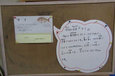 今日は熊本県よりいただいた「タイ(鯛)」に注目です。この鯛は、天草でとれたそうです。身が白く、ほかの魚に比べてくせがありません。鯛は、お祝いのときに出てくる魚です。大きさは20㎝~70㎝だそうです。今日のは、天玉あげにしてありました。身がほくほくしていて、たいへんおいしくいただきました。