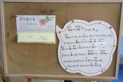 今日の注目は「さつまいも」です。今日は、さつまいもで作った「スイートポテト」がありました。さつまいもは荒れた土地でも育つ強い植物で、昔から食べ物が足りなくなったときは、お米の代わりに食べられてきました。給食では、汁物やサラダなどおかずとして出すことが多いです。おもにエネルギーのもとになる食べ物です。では、ここでクイズです。次の3つのうち、さつまいもと同じ仲間の植物はどれでしょうか。①じゃがいも、②あさがお、③りんご・・・答えは、②のあさがおです。さつまいもはヒルガオ科の植物の仲間です。暖かい地域では、アサガオに似たうすいピンクの花が咲きます。