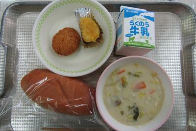 今日のメニューは、コッペパン、牛乳、白菜のクリーム煮、メンチカツ、スイートポテトでした。