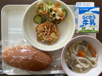 今日のメニューは、ミルクパン、五目うどん、かき揚げ、アーモンドサラダ、牛乳でした。