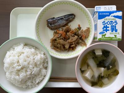 今日のメニューは、麦ご飯、大根のとろみ汁、イワシのおかか煮、カミカミきんぴら、牛乳でした。