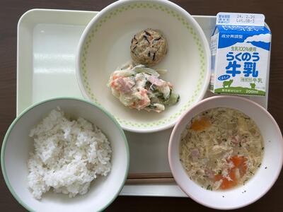 ポテトサラダは私の好きなおかずの一つですが、具材はさまざまです。じゃがいもとにんじん、キュウリ、ハムは定番として、給食でも今日のようにタマネギが入っていたり、りんごを入れてあったりしますね。今日は、じゃがいもがつなぎ程度で少なめ、タマネギスライスはタマネギ特有の辛みが全くなく、食べやすかったです。今日もおいしくいただきました。