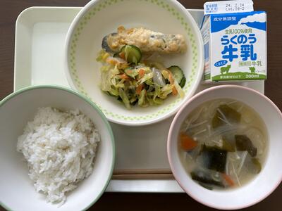 給食の汁物は「〇〇のみそ汁」のように、名前に具材がつくことが多いのですが、今日は「みそ汁」とだけあります。具材を確認したら「にんじん、タマネギ、じゃがいも、ネギ、えのきだけ、わかめ、豆腐、そうめん」でなんと8種類も。我が家ではこんなたくさんの具は入っていませんが、具だくさんの汁少々が体にいいと聞きました。今日もおいしくいただきました。