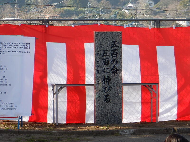 どんどやができあがった横で、100周年の記念式典を行いました。記念碑の除幕を見て、地域や卒業生の方々からの寄付金で作った立派な石碑をみんなで見ました。「五百の命、五百に。」と大里耕守元校長先生の毛筆が素晴らしかったです。その後、松永欣子さんが、坂下尋常高等小学校から始まった100年の学校の移り変わりのお話をしてくださいました。長い歴史を感じました。それから、みんなで風船飛ばしをしました。雲一つ無い青空にカラフルな風船が上がっていく様子は見事でした。