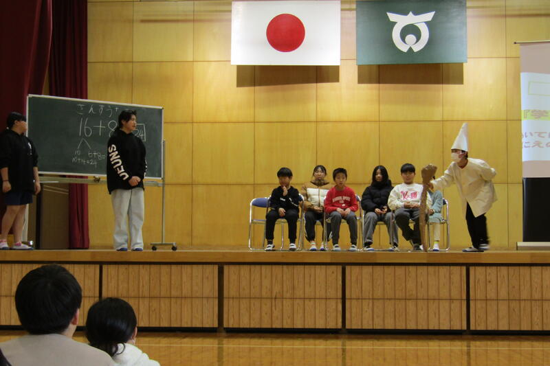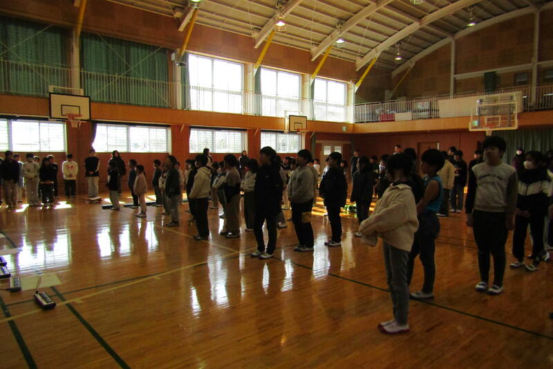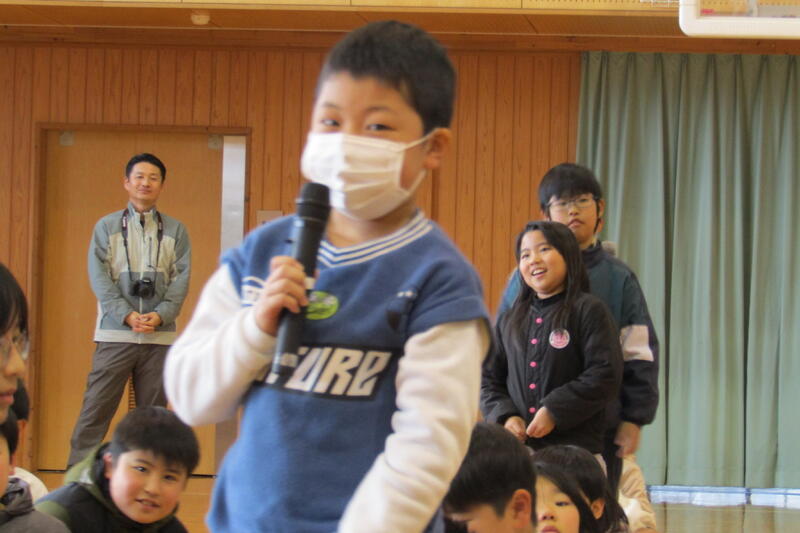 給食委員会は、よく噛んで食べることの大切さなどをクイズ等で発表しました。給食委員会も昼休みに集まって、発表の練習をしていました。そのため、大きな声で堂々と発表できました。返しの言葉では、「美味しい給食を好き嫌いせずに食べたいです。」「よく噛んで食べると体にいいことが分かりました。」などの感想がありました。今日もいい集会になりました。