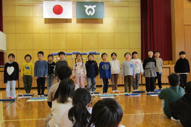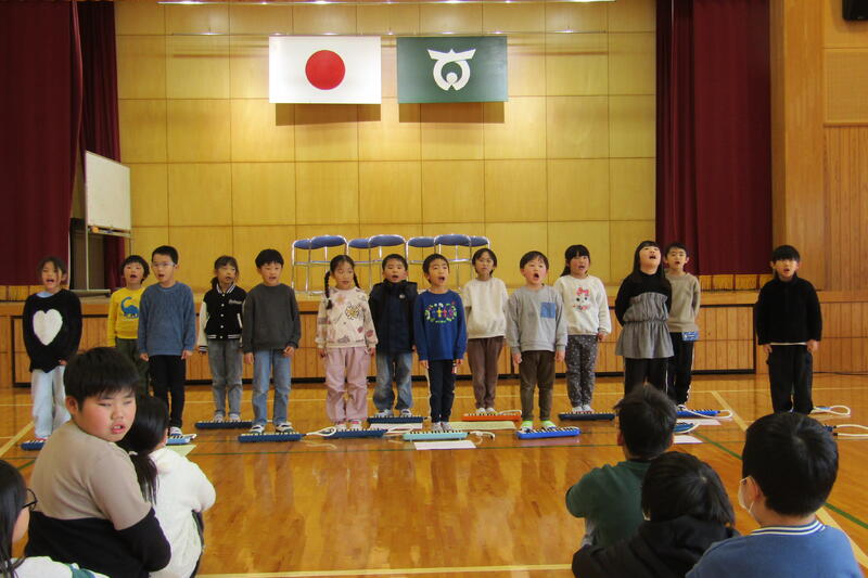 今日の集会では、2年生の発表と給食委員会の発表がありました。2年生は、音楽の授業で学習した「山のポルカ」などの鍵盤ハーモニカ演奏、歌の発表、木琴・鉄琴・タンブリン・小太鼓などの合奏がありました。説明のせりふ等がみんなに分かりやすいように、大きく、はっきりと言えるように2週間ぐらい前から頑張って練習していました。音楽の発表も進行の声も素晴らしかったです。