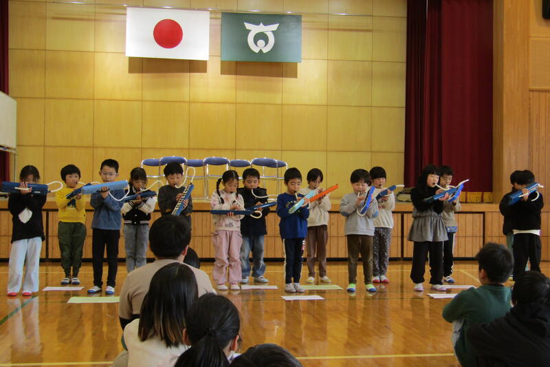 1年生の発表は盛りだくさんでした。国語で学んだ教科書を暗唱したり、自動車あてクイズを出したり、鍵盤ハーモニカで演奏したり、「海」を口を大きく開けて歌ったりしました。一生懸命に、いきいきと発表する1年生の子どもたちの姿を見ていると思わずシャッターをたくさん押してしまうほど素晴らしかったです。全校児童の前で頑張って発表することを目標に、これまでたくさん、みんなで力と心を合わせて練習したことが伝わりました。立派な発表で感動しました。入学してから、10ヶ月、毎日真面目に学習に取り組み、決まりを守って過ごして、大きく成長することができたなあと感じました。